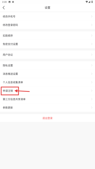 3、在設(shè)置頁面,點(diǎn)擊申請(qǐng)注銷選項(xiàng),進(jìn)入注銷風(fēng)險(xiǎn)確認(rèn)頁面。