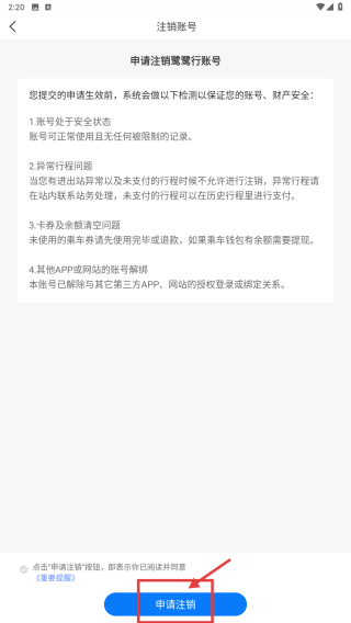 4、在注銷風(fēng)險(xiǎn)確認(rèn)頁面,點(diǎn)擊申請(qǐng)注銷按鈕,完成賬號(hào)注銷操作。