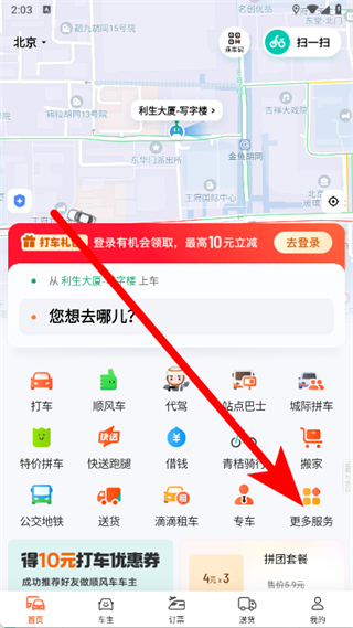 1、打開滴滴打車,點(diǎn)擊更多服務(wù)選項(xiàng),進(jìn)入頁(yè)面。