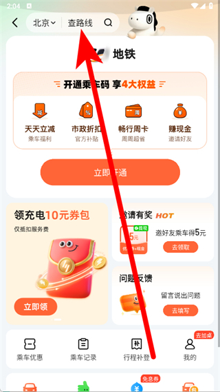 3、在公交地鐵頁(yè)面,點(diǎn)擊查路線搜索框,進(jìn)入搜索框。