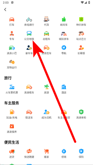 2、在更多服務(wù)頁(yè)面,點(diǎn)擊公交地鐵選項(xiàng),進(jìn)入公交地鐵專屬服務(wù)界面。