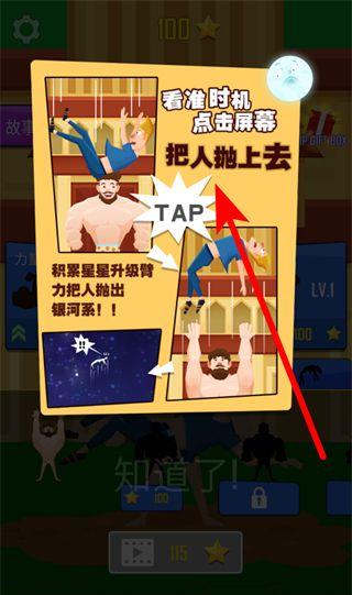 2、進入游戲后先看提示,看準(zhǔn)時機點擊屏幕把人拋上去,積累星星升級臂力,以便把人拋出銀河系。
