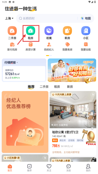 1、打開房產(chǎn)租賃應(yīng)用,點(diǎn)擊首頁租房選項(xiàng),進(jìn)入租房頁面。