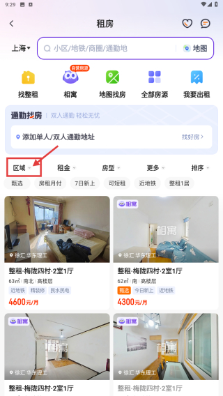 2、在租房頁面,點(diǎn)擊區(qū)域篩選條件,進(jìn)入?yún)^(qū)域篩選界面。