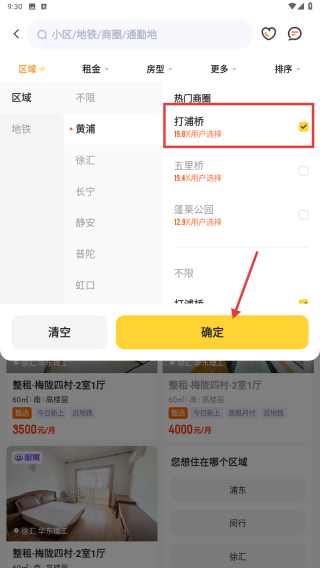 3、在區(qū)域篩選界面,找到打浦橋商圈并點(diǎn)擊確定,完成區(qū)域篩選。