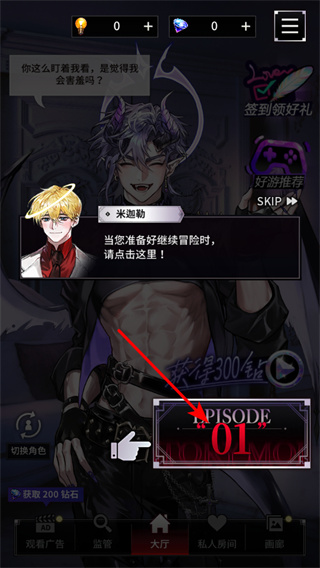 4、完成契約簽訂后,點擊EPISODE01按鈕開啟第一章劇情,這是推進主線冒險的關(guān)鍵操作,進入章節(jié)后將跟隨米迦勒引導(dǎo),解鎖更多核心玩法。