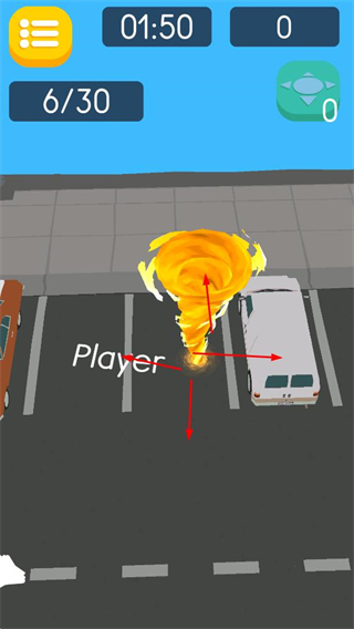 1、操控龍卷風(fēng)在停車場場景中移動(dòng),破壞車輛等物體,積累破壞數(shù)量,開啟破壞挑戰(zhàn)之旅。