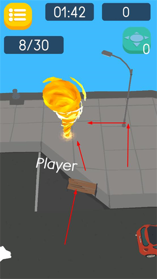 2、操控龍卷風(fēng)在城市街道場景中移動(dòng),破壞路燈、木板等物體,積累破壞數(shù)量,提升破壞成果。