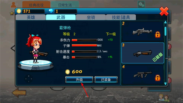 1、升級(jí)武器,提升武器屬性,增強(qiáng)戰(zhàn)斗能力,助力射擊冒險(xiǎn)。