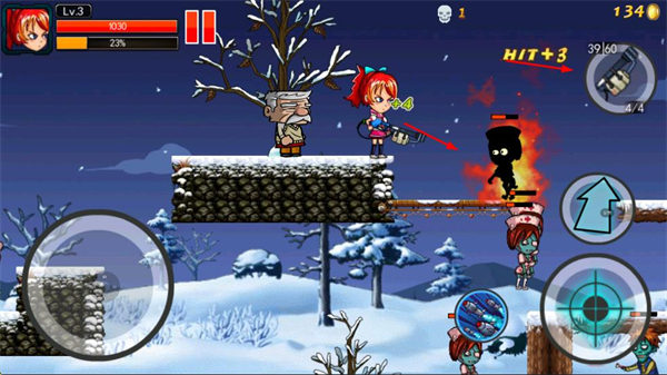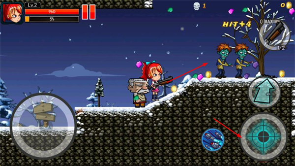 3、操控角色在不同場景中移動(dòng),點(diǎn)擊射擊按鈕攻擊敵人,積累連擊數(shù)。