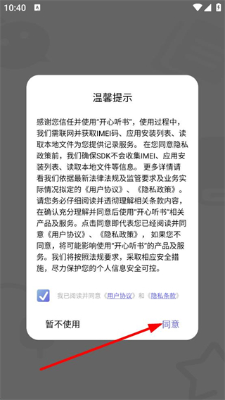 1、在溫馨提示彈窗中,點擊同意,進入APP首頁。