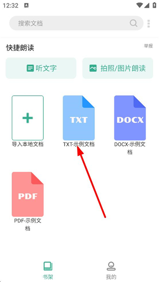 2、在APP首頁,點擊TXT示例文檔,進入聽書頁面。