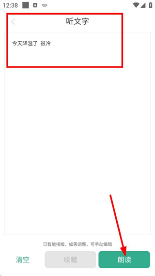 3、在朗讀頁面,可查看文字內(nèi)容并進行收藏、語速調(diào)節(jié)等操作。