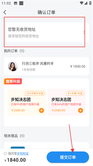 3、在確認(rèn)訂單頁面,添加收貨地址后點擊提交訂單可完成課程購買。