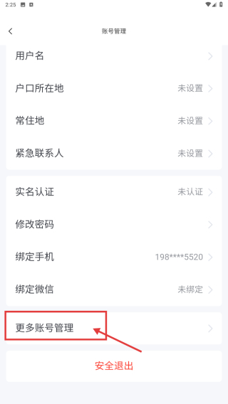 3、在賬號管理頁面,點擊更多賬號管理選項,進入更多賬號設置頁面。