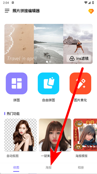 1、打開(kāi)照片拼接編輯器,主界面清晰核心功能,點(diǎn)擊底部海報(bào)選項(xiàng)。