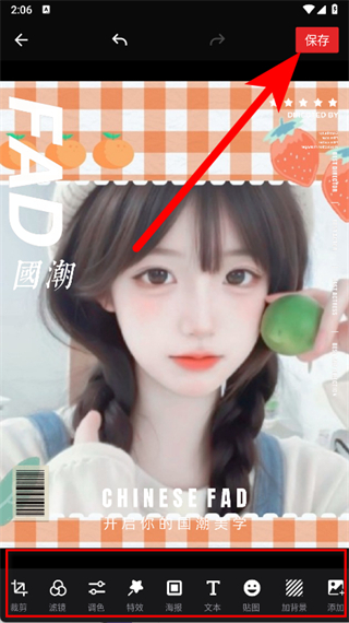 5、對(duì)照片進(jìn)行編輯后,點(diǎn)擊右上角保存按鈕,將制作好的海報(bào)保存至本地,完成創(chuàng)作。