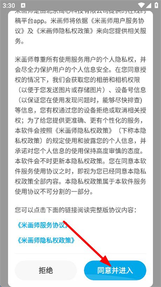 1、在服務協(xié)議彈窗中,點擊同意并進入,進入登錄選擇頁面。