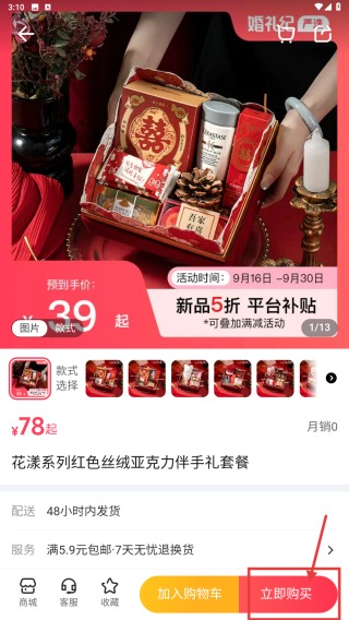 4、在商品詳情頁,點擊立即購買按鈕,完成該婚慶伴手禮商品的購買操作。