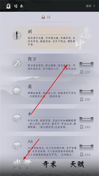 2、在培養(yǎng)界面的武學(xué)板塊,選擇劍、陌刀等武器進(jìn)行培養(yǎng),提升武學(xué)能力。