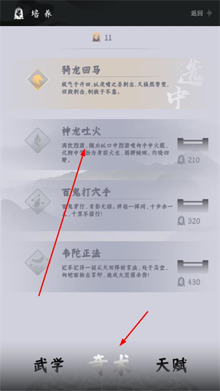 3、切換到奇術(shù)板塊,選擇騎龍回馬、神龍吐火等奇術(shù)進(jìn)行培養(yǎng),增強(qiáng)奇術(shù)技能效果。