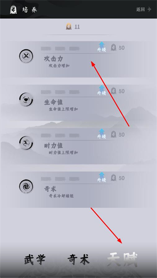 4、進(jìn)入天賦板塊,升級(jí)攻擊力、生命值等天賦屬性,提升角色整體實(shí)力。