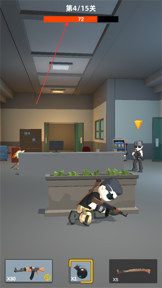1、在第4關(guān)利用掩體躲避敵人,觀察敵人位置,準(zhǔn)備攻擊。
