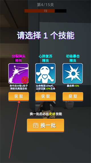 4、選擇技能如分裂彈頭稀有提升戰(zhàn)力,繼續(xù)消滅敵人,推進(jìn)關(guān)卡進(jìn)度。