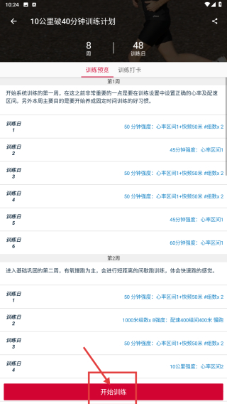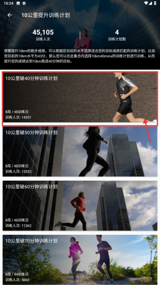 3、在訓(xùn)練計(jì)劃列表里,找到10公里破40分鐘訓(xùn)練計(jì)劃條目,點(diǎn)擊進(jìn)入訓(xùn)練詳情頁。
