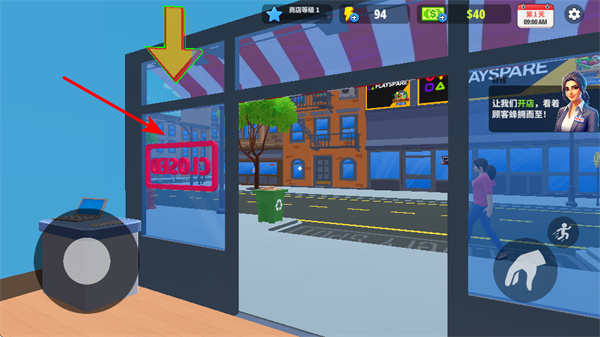 3、開啟超市營業(yè)時,點擊OPEN標識,這是迎接顧客的關鍵步驟,開啟后顧客將進入超市購物,推動超市經營進程。