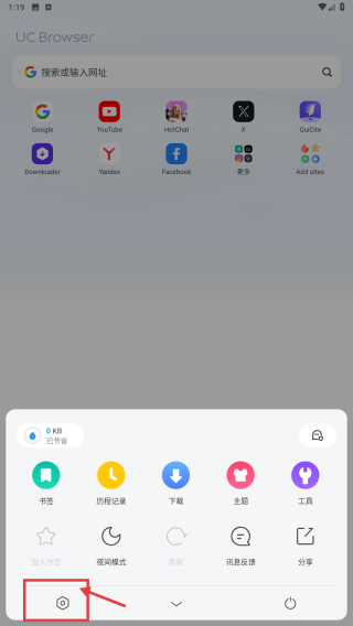 1、打開瀏覽器類應(yīng)用,點擊底部菜單按鈕,彈出功能菜單。