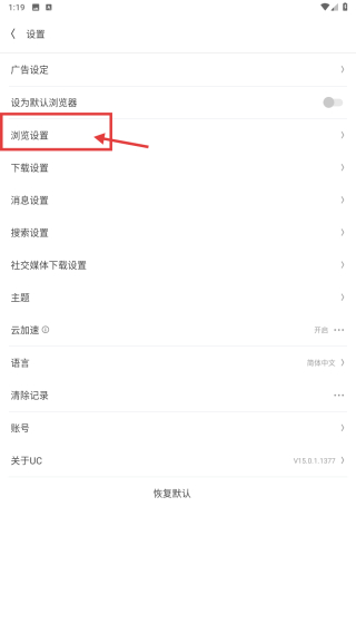 3、在設(shè)置頁面,點擊瀏覽設(shè)置選項,進入瀏覽設(shè)置頁面。