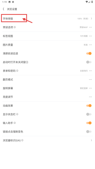 4、在瀏覽設(shè)置頁面,點擊字體排版選項,即可進行字體排版的相關(guān)設(shè)置。