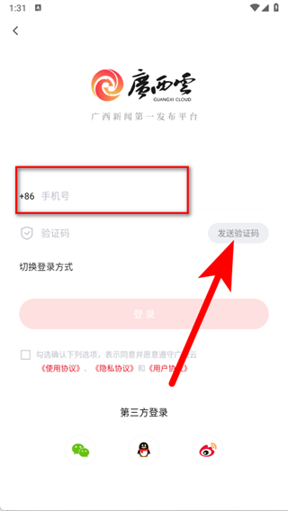 3、在登錄界面,輸入框中填寫號碼,點擊發(fā)送驗證碼按鈕。
