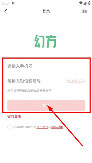 4、在信息填寫頁面,輸入手機號、短信驗證碼,點擊登錄,完成賬號登錄。