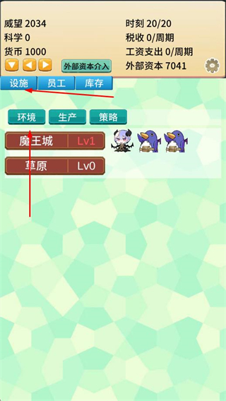 1、點(diǎn)擊設(shè)施,在環(huán)境板塊中升級(jí)魔王城、草原等設(shè)施,提升經(jīng)營(yíng)基礎(chǔ)。