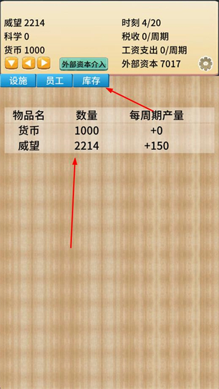 3、點(diǎn)擊庫(kù)存,查看貨幣、威望等物品的數(shù)量和每周期產(chǎn)量,了解經(jīng)營(yíng)收益情況。