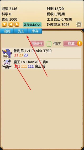 2、點(diǎn)擊員工,招募普利尼、魔王等員工,查看員工屬性,合理安排員工崗位。
