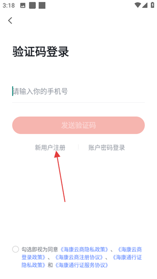 3、在登錄選擇頁面,點擊新用戶注冊可進入快速注冊頁面。