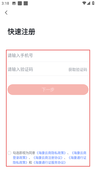 4、在快速注冊頁面,輸入信息,同意協(xié)議后點擊下一步可完成賬號注冊。