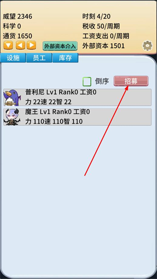2、在員工界面點擊招募按鈕,進入可招募的員工界面。
