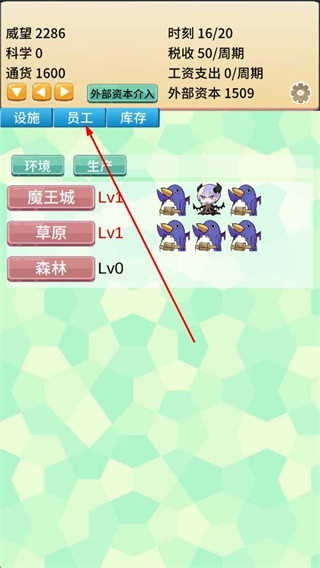 1、進入游戲后,點擊員工按鈕,查看現(xiàn)有員工情況,了解員工的力、速、智等屬性。