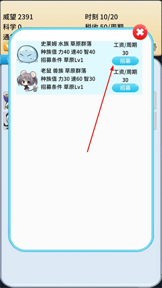 3、選擇符合招募條件的員工,如史萊姆等,點擊招募進行招募。