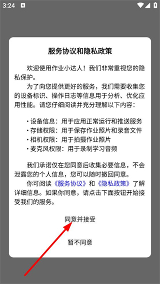 1、在服務(wù)協(xié)議和隱私政策彈窗中,點(diǎn)擊同意,進(jìn)入首頁。