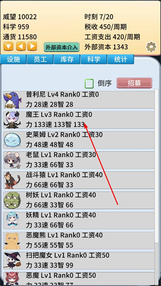 1、點擊員工,查看現(xiàn)有員工,了解員工的力、速、智等能力。