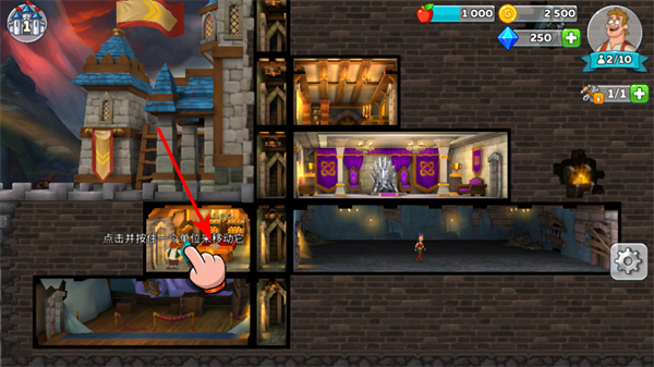 1、進入游戲后,點擊并按住房間位置移動,這是布局城堡的關(guān)鍵操作,可合理規(guī)劃城堡建筑分布,優(yōu)化資源利用。