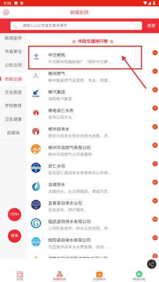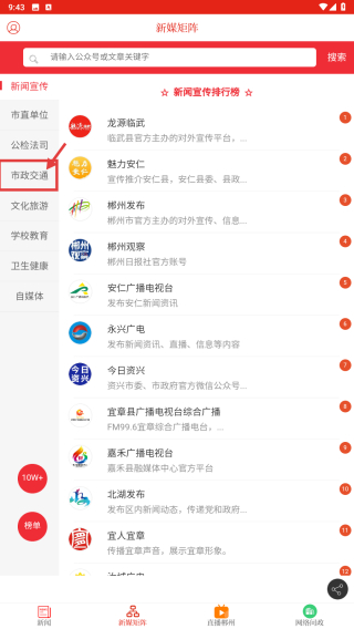 2、在新媒體矩陣頁面,點(diǎn)擊市政交通分類選項(xiàng),瀏覽市政交通類單位列表。