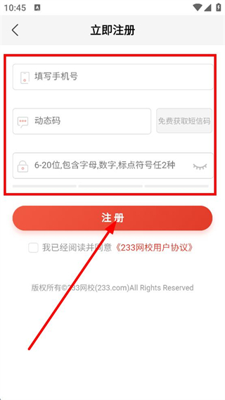 4、在立即注冊頁面,填寫手機號、動態(tài)碼,設(shè)置密碼后,點擊注冊,完成賬號注冊。