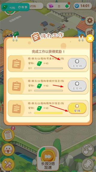 1、完成待辦工作,獲取獎(jiǎng)勵(lì),積累資源,開啟養(yǎng)老院經(jīng)營(yíng)之旅。
