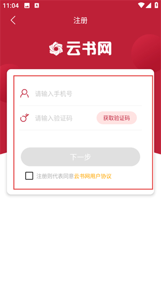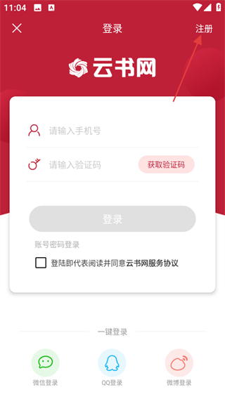 3、在登錄選擇頁面,點(diǎn)擊注冊可進(jìn)入云書網(wǎng)注冊頁面。